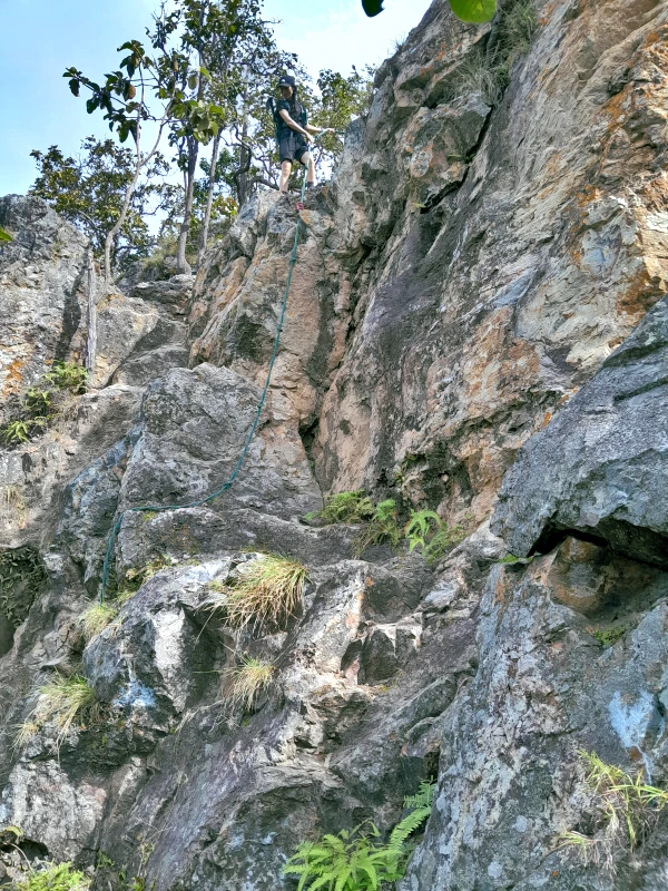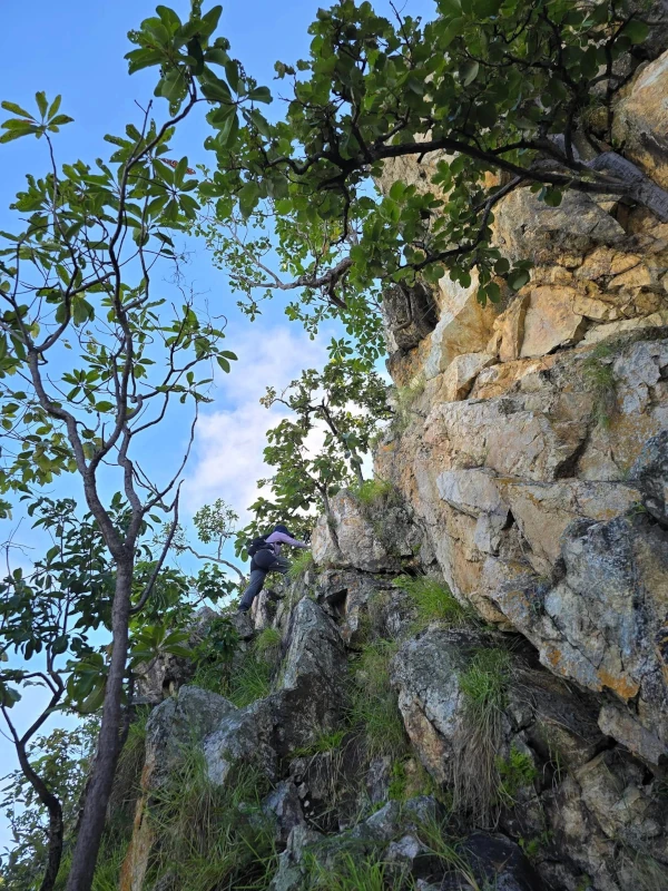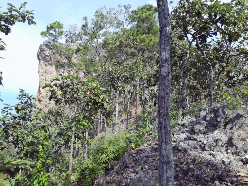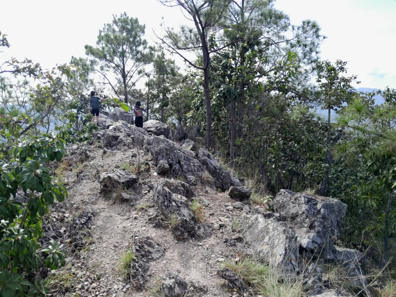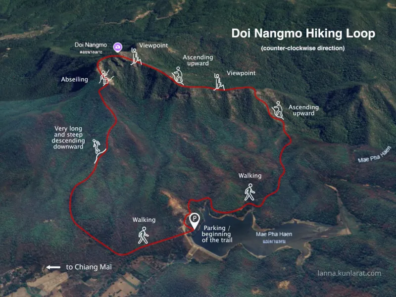 The rocky ridge of Nangmo Mountain, located 30 kilometers east of Chiang Mai city center, offers a panoramic view of Mae On District and Doi Suthep Mountain. This 8.8-kilometer loop trail is considered challenging due to a section where hikers must descend (or ascend, depending on the direction) a vertical cliff using a rope.