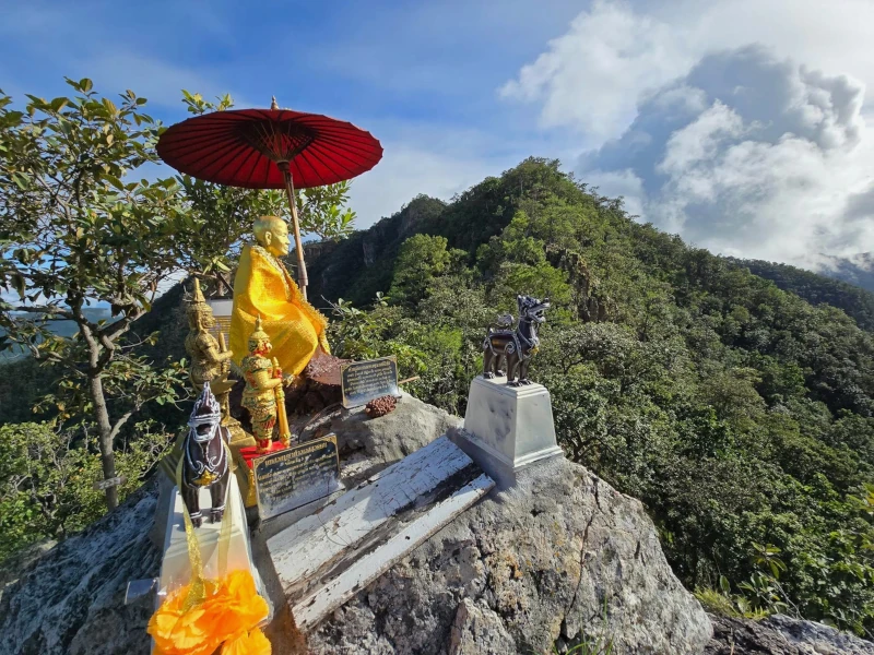 Winding your way through through sharp rock formations, not far from the top of Doi Nangmo you will encounter a viewing platform with a small altar featuring a statue of Buddha. This spot is particularly popular for selfies along the route.